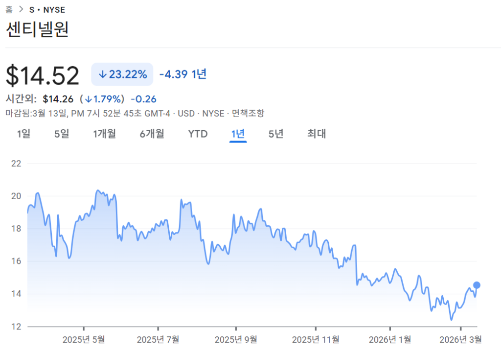 6. 센티넬원 주가는 뛰어난 실적 성장에도 불구하고 지난 1년간 약 29%가량 폭락하며 극심한 기업 가치 훼손을 겪었음.